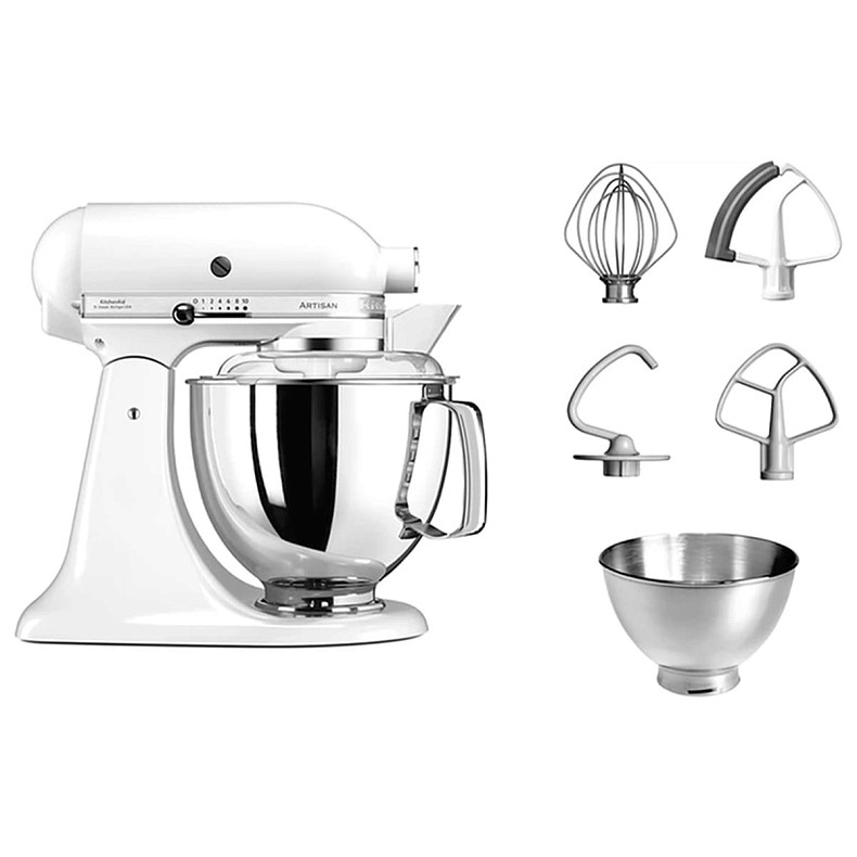 Комплектація | Планетарний міксер, Основна чаша, Додаткова чаша, Крюк для тесту, Лопатка для змішування, Лопатка з гнучким ребром, Віночок для збивання, Інструкція, Гарантійний талон, Упаковка |
