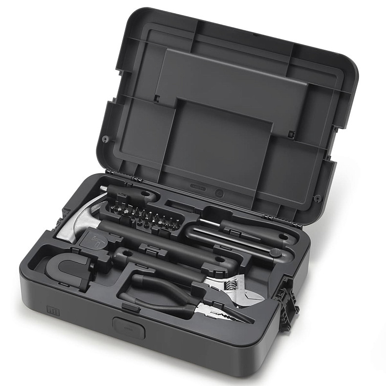 Комплектація | Отвертка с 20 различными битами, Молоток (гвоздодёрный), Длинногубцы, Разводной ключ, Строительный нож, Скребок, Защитные колпачки, Кейс для хранения |