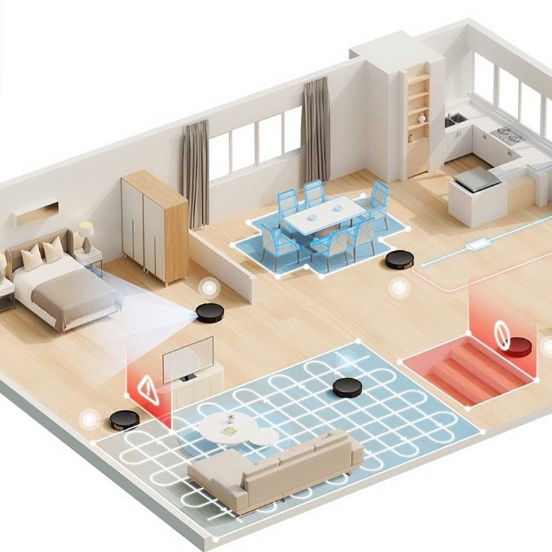 Режимы уборки | Выбор комнаты (зоны) уборки, Режим Авто, Режим Уборка по периметру, Возвращение на базу из любой комнаты, Автоувеличение мощности на коврах, Режим Уборка зиг-загом, Запоминание этажей |
